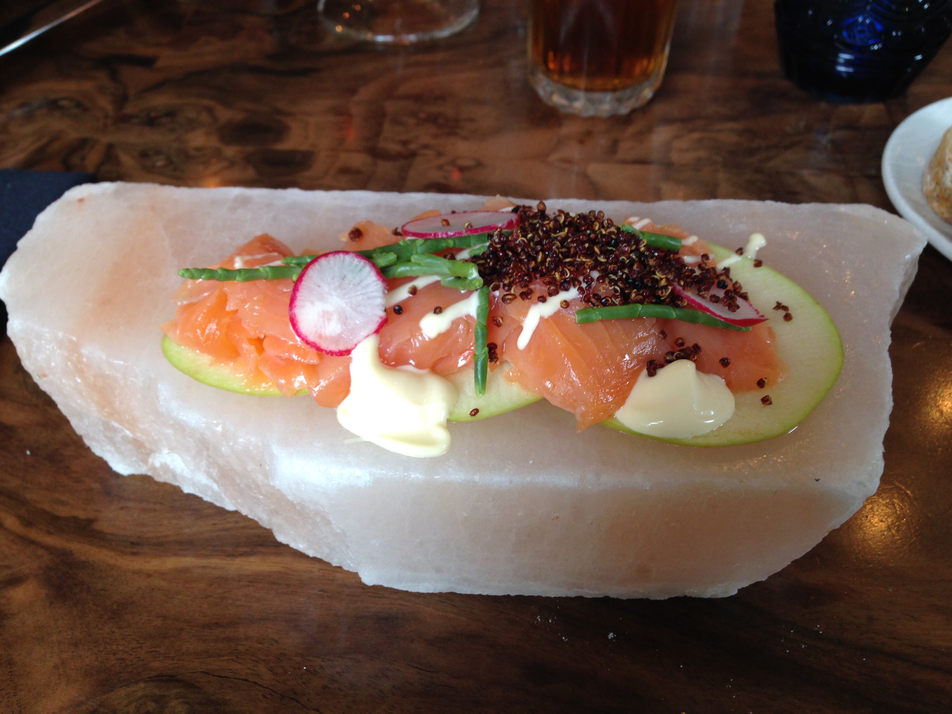 És íme a jól megérdemelt ebéd. Előételnek egy kis sea trout, Himalaya són