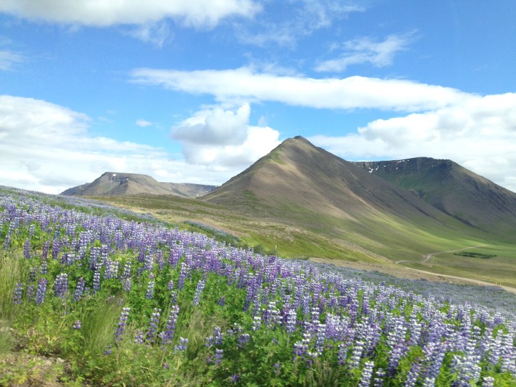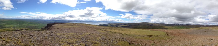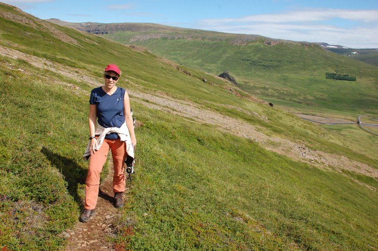 Ma reggel napsütés! Hans volt futni, én ma kíméltem a lábam. 9 előtt útnak indultunk, hosszú az út ma. Először az Edda Hotelnél álltunk meg Akureyri-ben, ahol felmásztunk a hegyre. Egy jó kis 2 órás túra volt, jó volt megmozgatni a tagjainkat. És pólóban mehettünk, csak fent volt elég szeles.