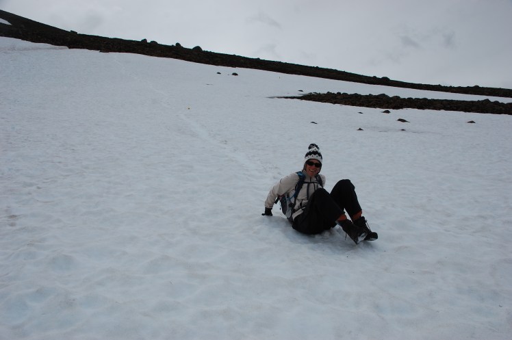 Végig szép időnk volt, csak a csúcs közeledtével lett elég szeles. Fent aztán megettük a kis szendvicseinket, majd irány lefelé – ami nekem, mint mindig, nehezebben ment mint felfelé. Legalább a havas részeken fenéken csúsztam az esőnadrágom segítségével.