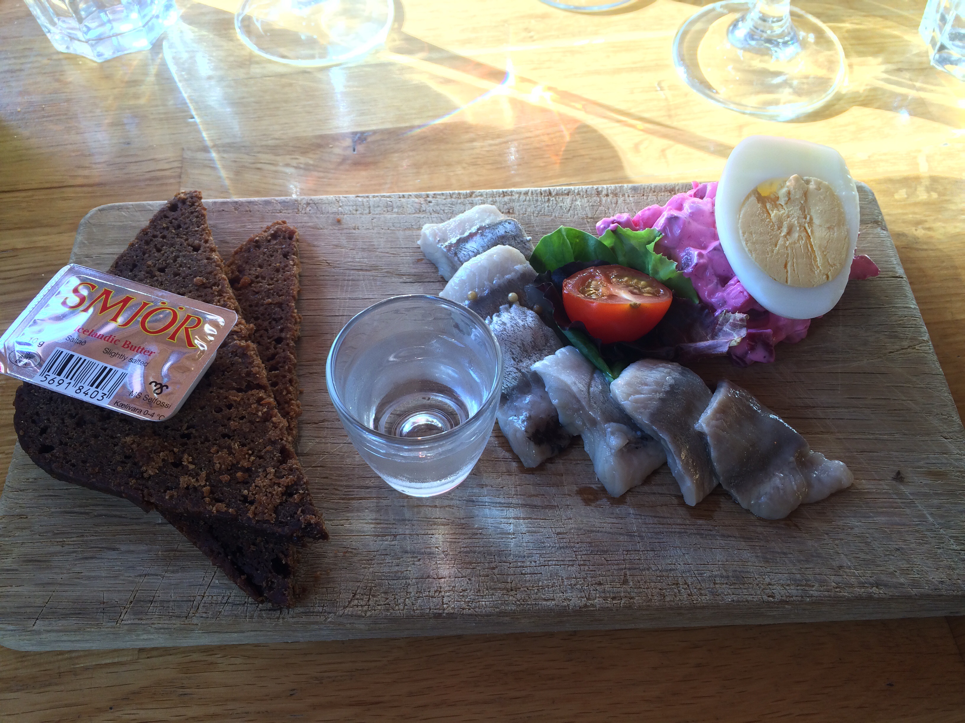 Abendessen war sehr gut. Fisch (Hering) und Fisch (Lachsforelle). Danach noch ein Drink im Sonnenschein in einer Bar.