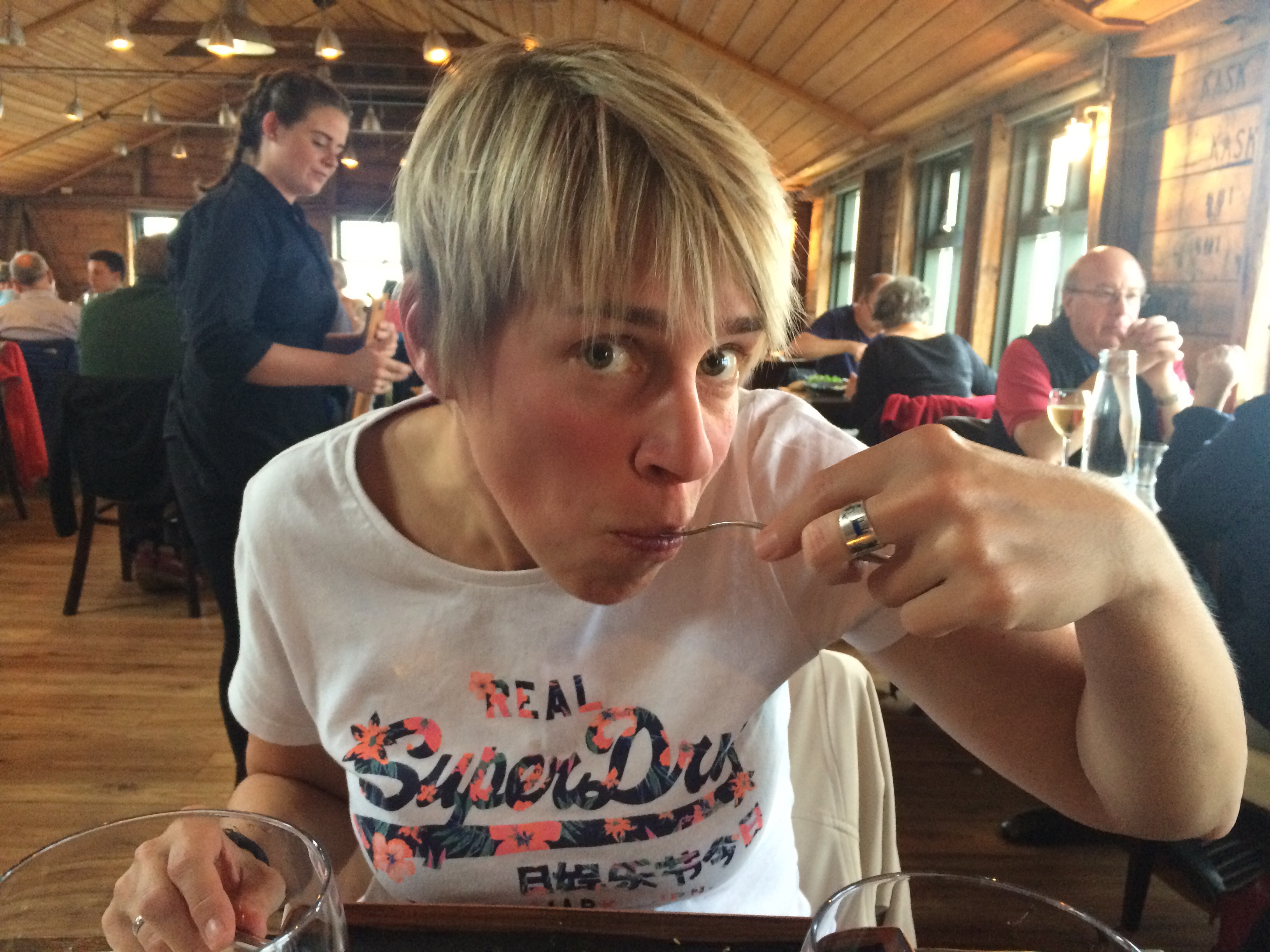 Weiter dann zum Heinabergjökull und dort nochmals 70 Minuten wandern bevor wir nach Höfn zum Einkaufen und ins Bad gefahren sind. Das Bad war sehr gut. Ein Freibad mit Schwimmbecken und einigen heißen Pools und einem Eisbecken (echt kalt, so wie der Name eben schon sagt). Nach 3 Kneipprunden warm, wärmer, heiß und Eis sind wir wieder gegangen und jetzt essen wir im Pakkhus, und zwar sehr sehr gut. Heute mal Fleisch: konfierte Entenkeule mit einem herrlichen glacierrten Schweinebauch. Hmmmm!