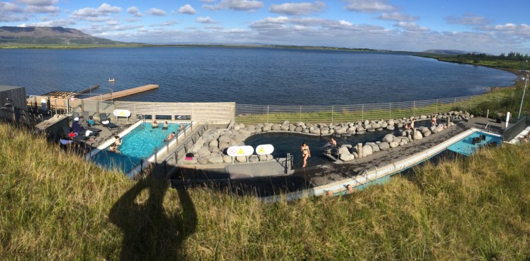 Und in der Zwischenzeit war es richtig sonnig und warm geworden. Also auf nach Laugarvatn und ins Bad. Das Bad dort ist schön, aber im Gegensatz zum Bad von Höfn hat es zwar architektonisch mehr zu bieten aber kein Kaltbecken und keine Wäscheschleuder zum trocknen der Badehose. Kostet aber 5 mal so viel. Es war torzudem super, denn man kann auch in den See gehen, der auch angenehm warm vom heißen Wasser ist.