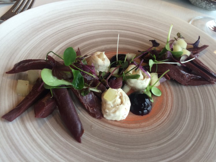 Dann noch rasch nach Hause und jetzt sitzen wir im Hotel Rangà und essen. Der 1. Gang war ein geräucherter Papageientaucher. Ausgezeichnet wars. Dann noch hervorragenden Lachs und Karottendessert.