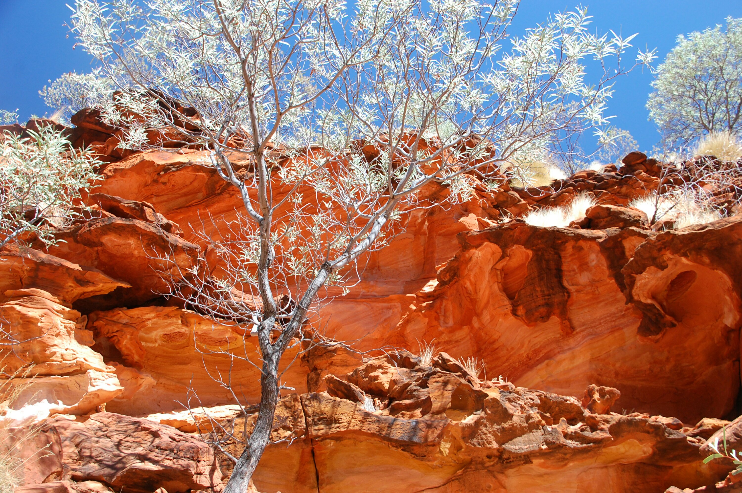 Danach haben wir noch 2 kurze Wanderungen im Kings Canyon gemacht. Die Farbebpiele hier sind sehr schön. Das leuchtende rot der Felsen und des Sandes, der tiefblaue Himmel und die vielen grün und Weißtöne der Vegetation.