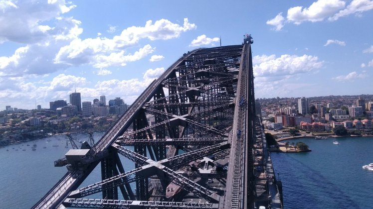 Ebéd után felsétáltunk a híd egyik pillérjére, ahol van egy kilátópont. Jó kilátás van körbe a városra, valamint azokra, akik a Harbour Bridge Climbe attrakciót választották (potom 200 dollárért) és felsétálnak a híd ívén. Még jó, hogy ennyibe került, különben Hans fel akart volna menni 🙂