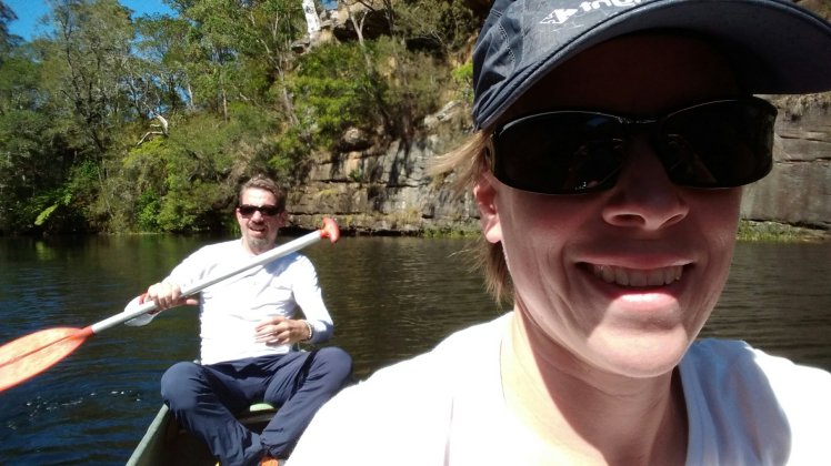 Észrevettük aztán, hogy lehet itt csónakokat meg kenukat bérelni, és mivel csendesnek és szépnek tűnt a folyó, béreltünk egy órára egy kenut. Nagyon jó döntés volt, jó kis program lett végülis ez a kirándulás. Sajnos a beharangozott echidna-kat nem láttuk (ez még hiányzik a listánkról), de gyönyörű nyugodt volt a folyó, alig voltak más csónakosok, sok madár volt.