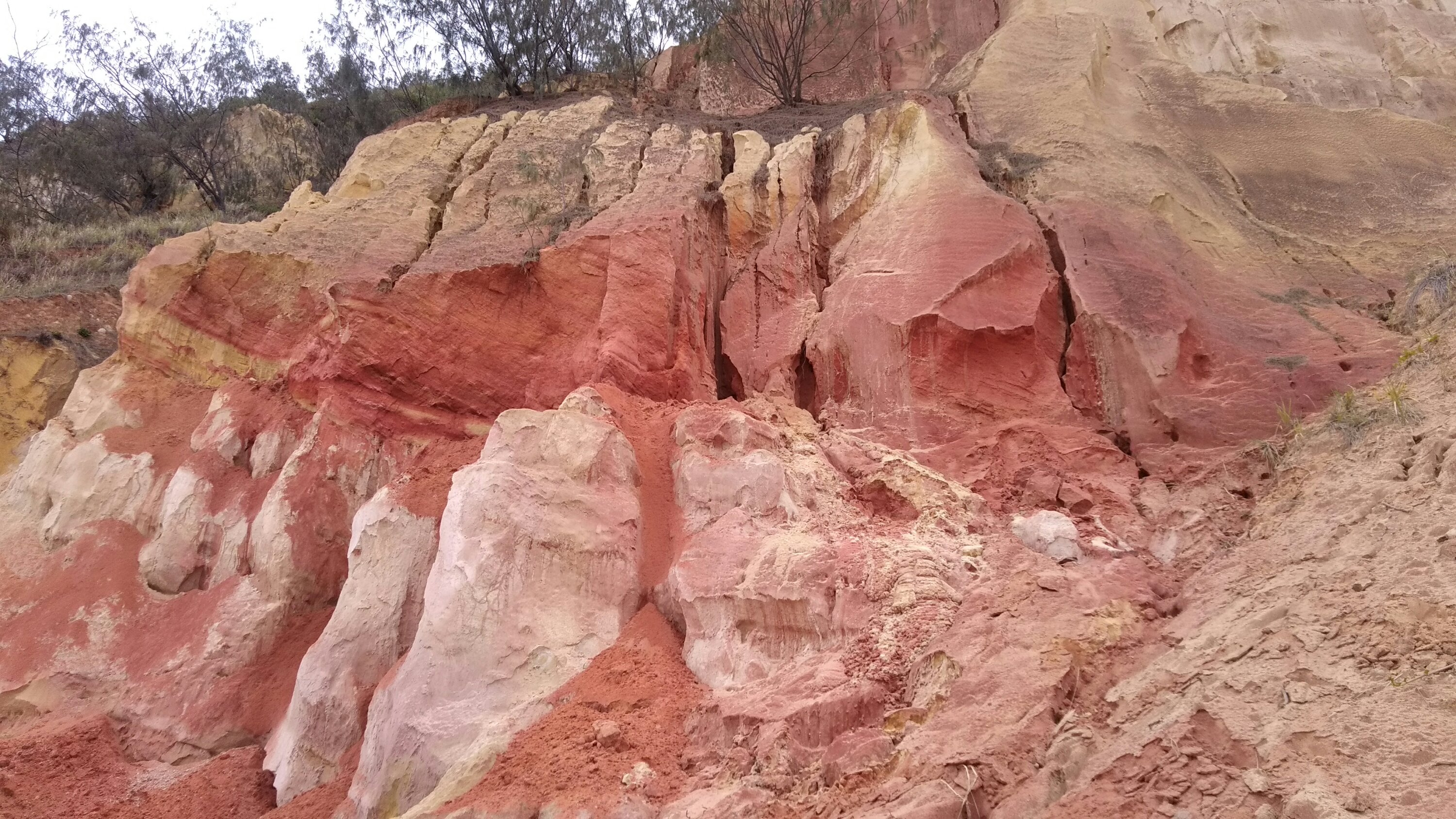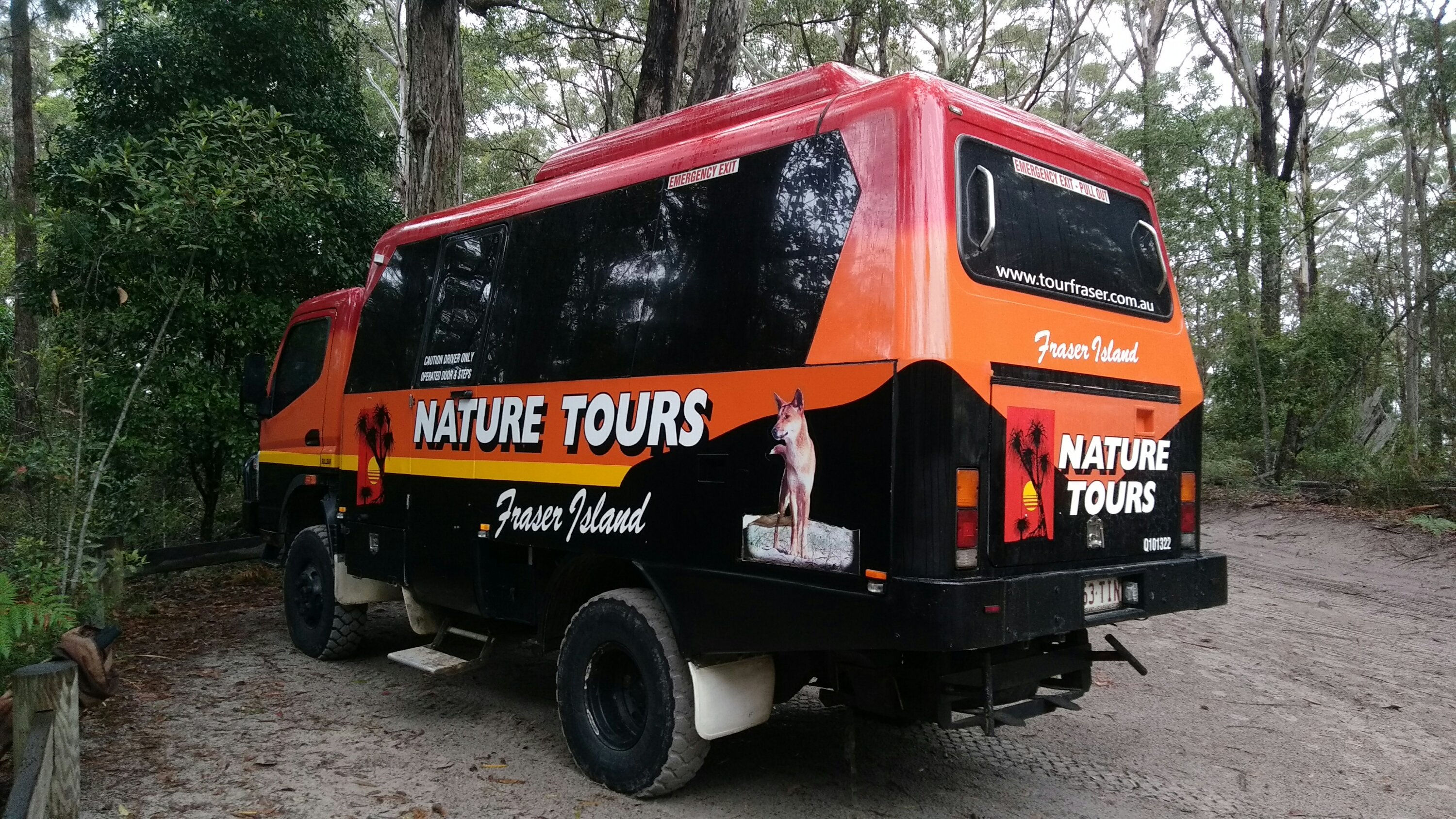 Időben jöttek értünk, 12-en vagyunk a mi buszunkban, összesen 2 busz megy ma ettől a cégtől. Először átkeltünk a Noosa folyón, majd itt a szárazföldön mentünk fel a kompig. Az odavezető út is már csodás volt, mivel most reggel van apály, a parti úton mentünk. Ami konkrétan azt jelentette, hogy a strandon, a homokban. Mivel ezt már sokáig használták szabályozás nélkül, fogták magukat a hatóságok és kinevezték útnak, így most ellenőrzik, hogy ne legyél ittas, vagy a gyerek elől ne üljön az öledben, ilyesmik. Az út nagyon szép volt, láttunk bálnát és delfineket is. A homok pedig néhány helyen szép színes a különböző ásványi anyagoktól. Egy ilyen szép helyen álltunk meg egy reggeli kávéra.