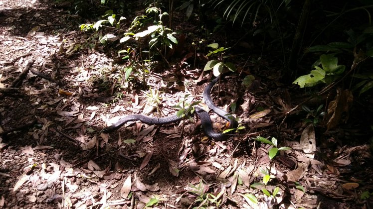 Első túra a Lake Barrine körül vezet minket. Állítólag 5 km, bár a mi óránk szerint inkább csak 4. Akárhogy is, nagyon jó kis séta volt, végre nem esik, süt a Nap, szinte egy emberrel se találkoztunk, csak a körút elején. Láttunk viszont klassz esőerdőt, egy csomó vad pulykát, valamint egy fekete kígyót is!! Úgy nézett ki mozdulatlanul az úton, mint aki éppen nagyon élvezi a Napot és talán éppen emésztett.
