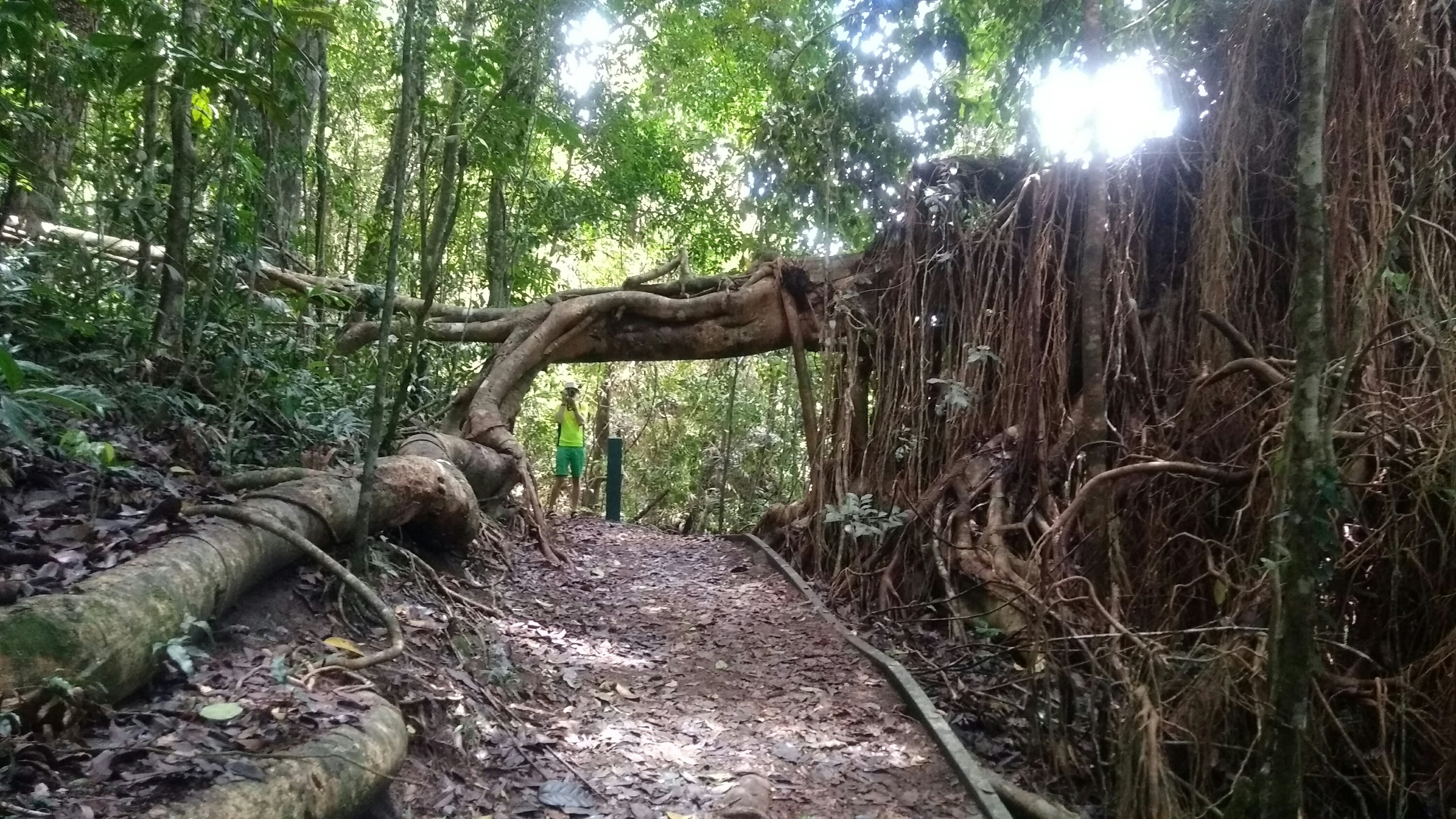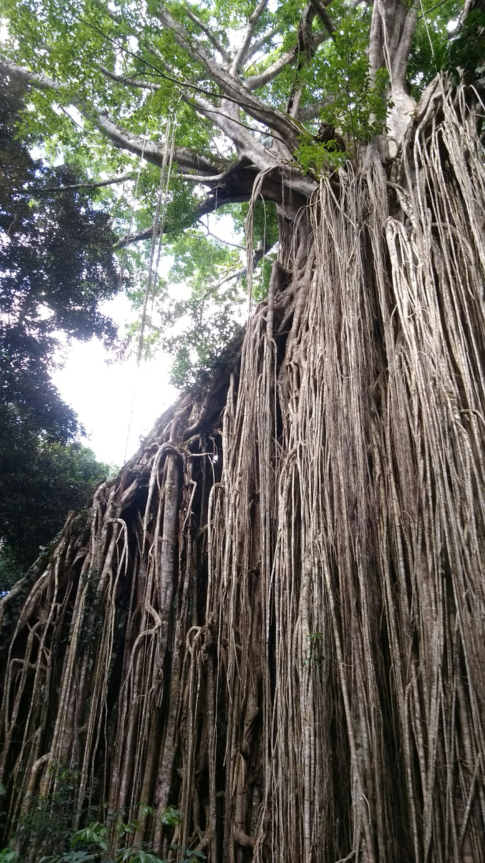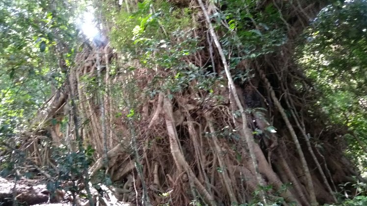 Most irány a Curtain Fig Tree, amit azért hívnak így, mert olyan szélesen nőttek a levegő-gyökerei hogy tényleg úgy néz ki, mint egy nagy függöny. És azért ilyen ferde, mert az eredeti fa, amire támaszkodva nőtt és amit elfojtott a fügefa, a súlyától nekidőlt a mellette lévő fának, majd a füge ebből az állapotból eregette lefelé a gyökereit.