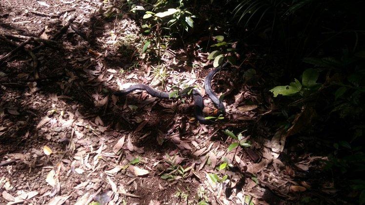Angekommen haben wir die 5km Runde durch den Regenwald rund um den See gemacht. Ich glaube wir haben 20 Buschtruthähne gesehen und unsere erste Schlange an Land direkt neben dem Weg. Sie war friedlich.
