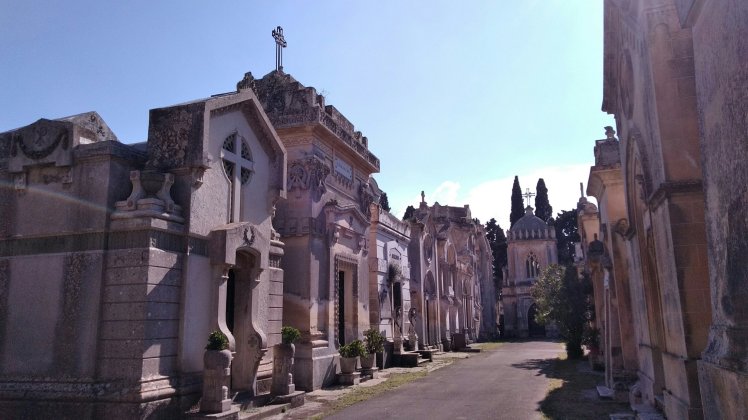 Fagyi, majd egy közeli parkban pihenünk egyet. El is aludtunk a padon. Egy frissítô kávé, majd kisétáltunk a temetôhöz. Ez csak 4-kor nyit, úgyhogy pár helyi öregasszonnyal (ôk mind kocsiban) várunk 10 percet. Úgy tervezzük, jól idôzítve 5-re kellene visszaérni a városba, akkor ihatjuk a következô proseccot 🙂