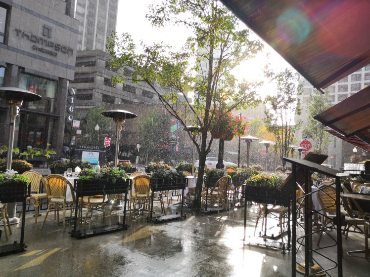 Vissza a hotelhez, még egy happy hours ital zuhany előtt. Közben a zuhany fentről is jött, szerencsére mi ernyő alatt ülünk 😊