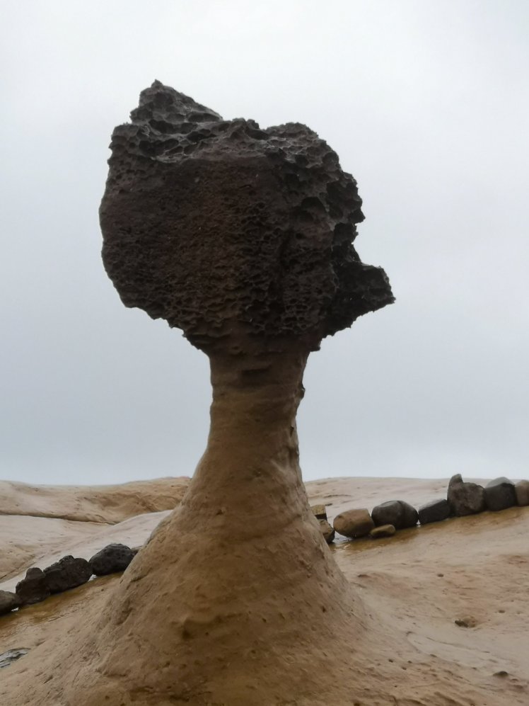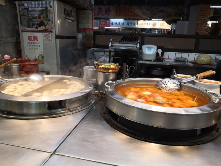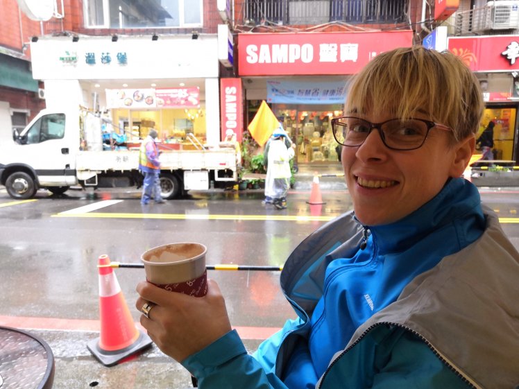 Im Yehliu Geopark war es echt nass. Hat sich auch in Ruifang nicht gebessert. Haben im lokalen Food Court zwei Snacks als Mittagessen gehabt und geniessen jetzt Torte und Kaffee im Freien aber trockenen.