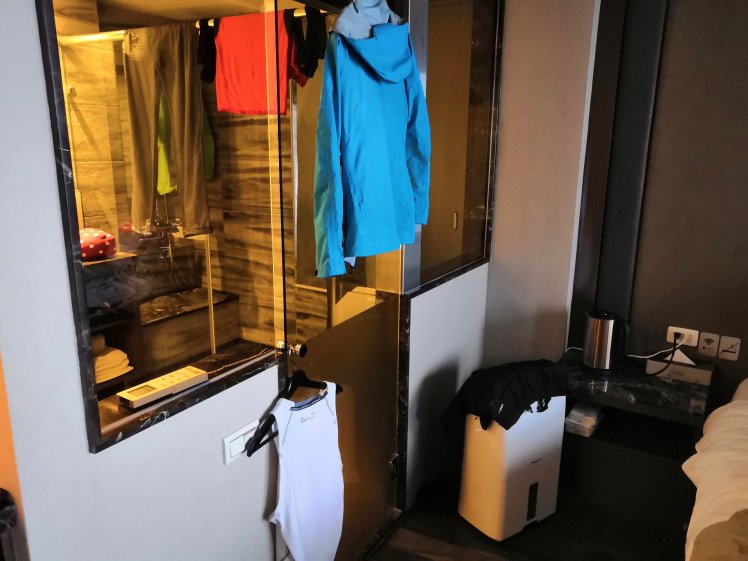 Unser Hotel liegt hoch oben in Jiufen und ist mit dem Auto nicht erreichbar. Also mussten wir zu Fuß mit den Rucksäcken rauf. Danach waren wir durch und durch nass. Ich bin nochmals zum Auto und dann war ich triefend nass. Jetzt wird alles so gut wie möglich getrocknet.
