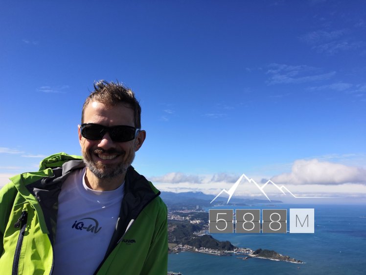 Mivel ilyen jó idő van, ki kell használni és felmentünk a Keelung dombra/hegyre. 1448 lépcső, 588m, fél óra. Most viszont jó nagy szél van. Innen ma a Taipei 101 is jól kivehető.