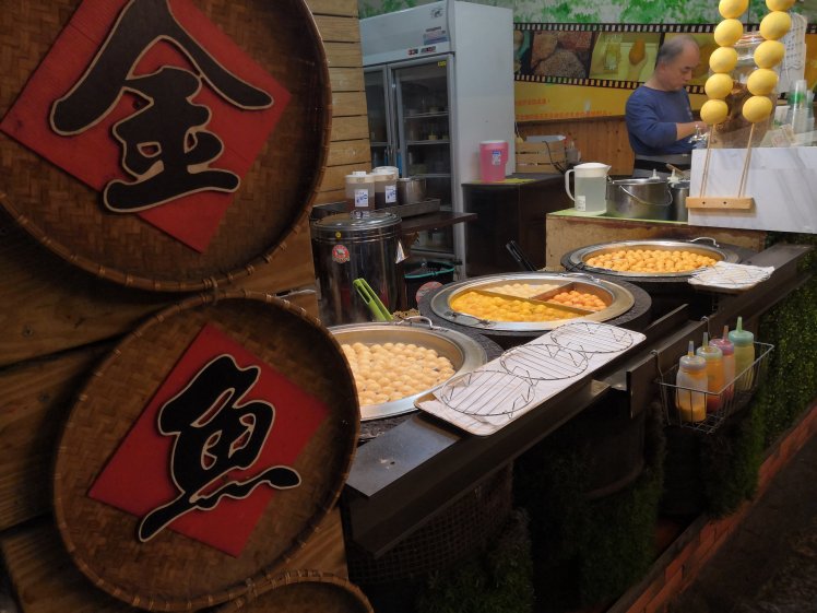 Zu Mittag gab es noch gebackenen Tintenfisch und dann ein Taiwan Hot-Dog. Klebreisweckerl mit einer Bratwurst. Aber alles ist irgendwie etwas süß. Auch die Schweins Bratwurst.
