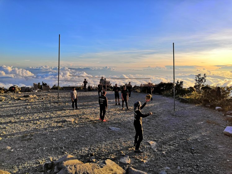 Alattunk beálltak a felhők, lassan lemegy a nap, a csúcson jól látni a holnapi utat. Jó pár guide röplabdázik. Kicsit még kint voltunk éves után, most lassan pihenő lesz. A legjobb holnap hogy a csúcsmenetet hátizsák nélkül tesszük meg, az azért sokkal egyszerűbb lesz. Utána még itt egy második reggeli mielőtt lemegyünk.