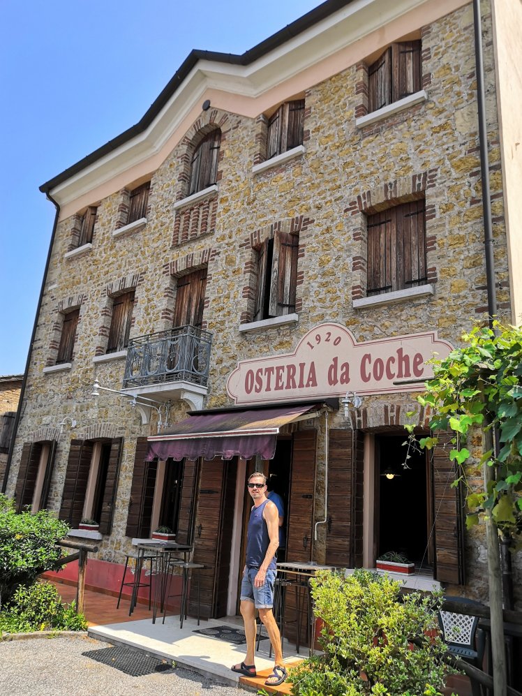 Mittlerweile sind wir gut in San Daniele angekommen und auch schon ein 2kg Schinken gekauft. Enorm schwül ist es jetzt. Das Gewitter schleicht herum aber kommt nicht. Sind zumindest trocken im Zentrum angekommen wo wir jetzt einen Schaumwein und ein Bier genießen.