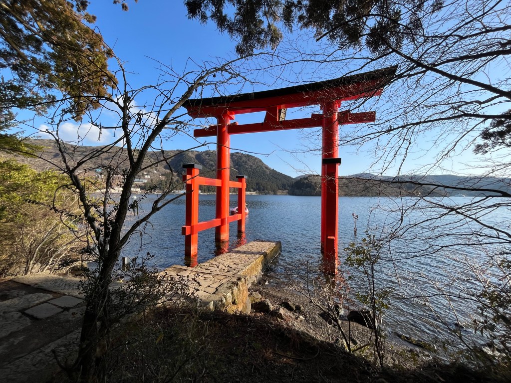 Nach kurzem Spaziergang am Seeufer und etwas in den Geschäften schauen haben wir uns noch ein Vanille-Grüntee Softeis gegönnt und sind dann weiter zum Hakone Shrine Tor.