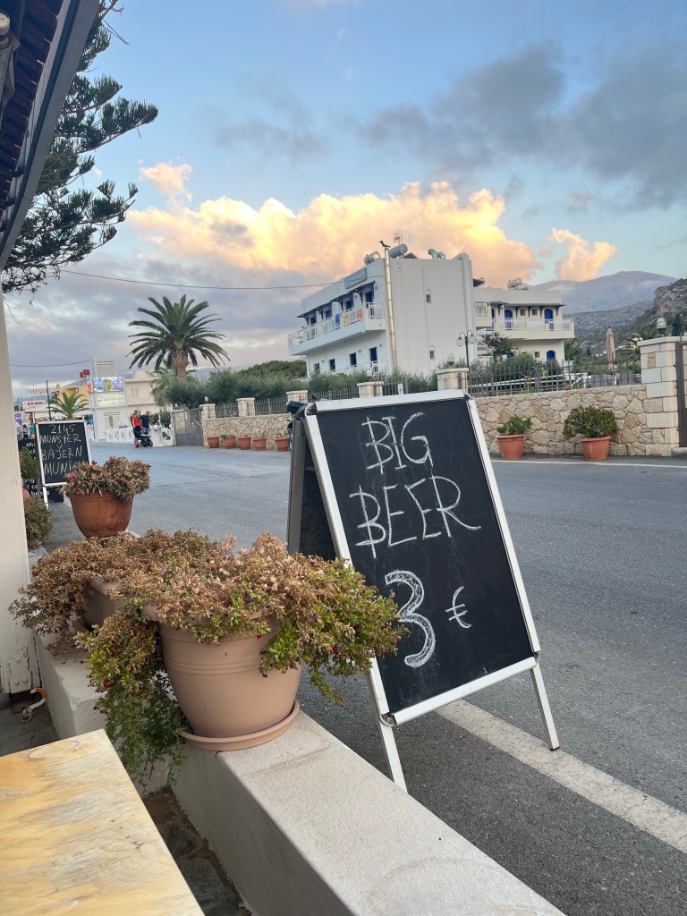 Nach einem Tag am Strand sind wir jetzt auf der ‘Ausgehmeile’ (einzige Straße) um einen Sundowner zu uns zu nehmen, weil hier die Preise noch in Ordnung sind.