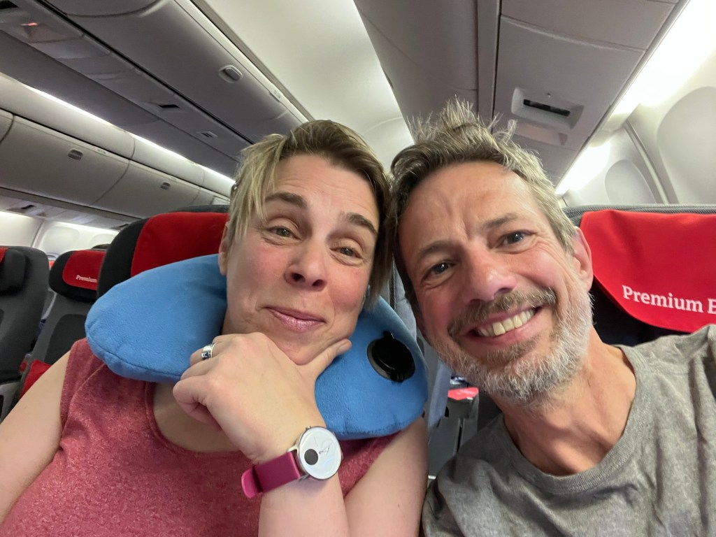 Jetzt sitzen wir im Flieger und warten auf den Abflug. Flugzeug nicht ganz voll, wir hoffen es wird ein ruhiger Flug.