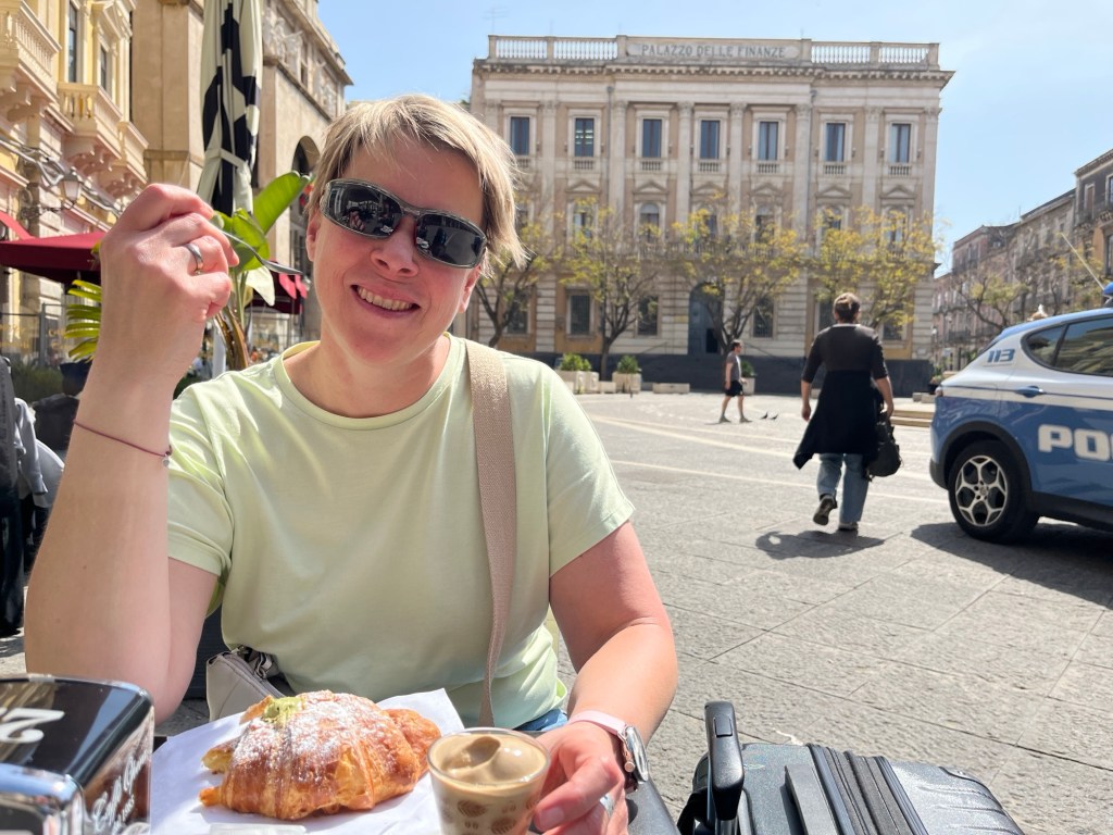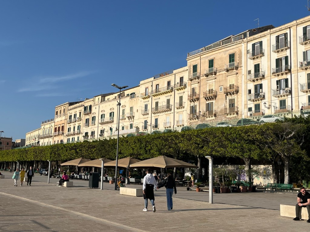 Apartment ist nett und schön. Sind noch schnell Obst und Frühstück kaufen gegangen und dann wollte Orsi zum Strand schwimmen gehen aber den angeblichen Strand, der 24h offen hat den gibt es eigentlich nicht. Es gibt eigentlich keinen Zugang zum Meer, um zu schwimmen. Traurig. Sonst sind diese Städte alle extrem fußgängerfeindlich. Und Siracusa auch extrem touristisch. Naja, bald sind wir dann in ruhigeren Ortschaften. Bis dahin genießen wir es trotzdem – Wetter sehr gut.