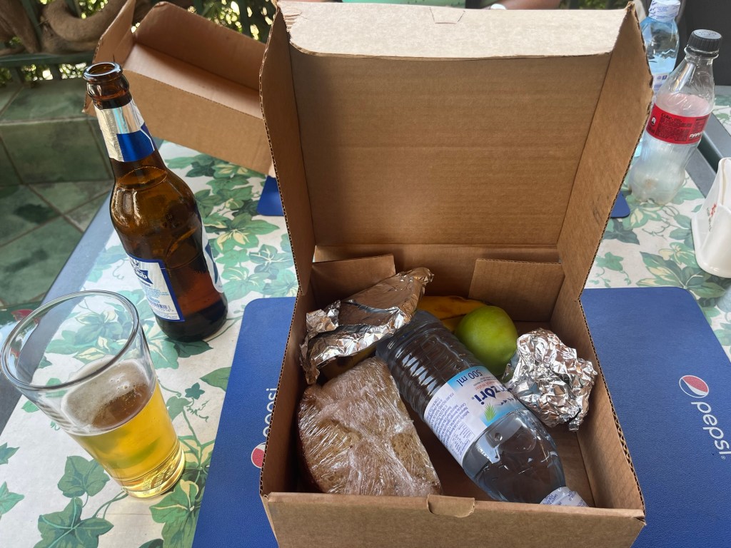 Nach 4:30 oder 200km gibt es in Mbarara (zweitgrößte Stadt) ein Mittagessen (Lunch Box).