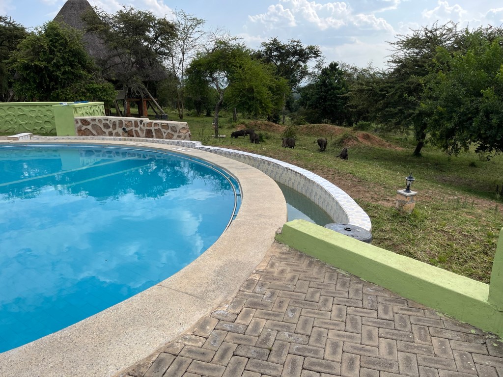 Und jetzt erfreuen wir uns am Pool an einem Tonic und Bier und schauen den Pavianen und Warzenschweinen neben uns zu.