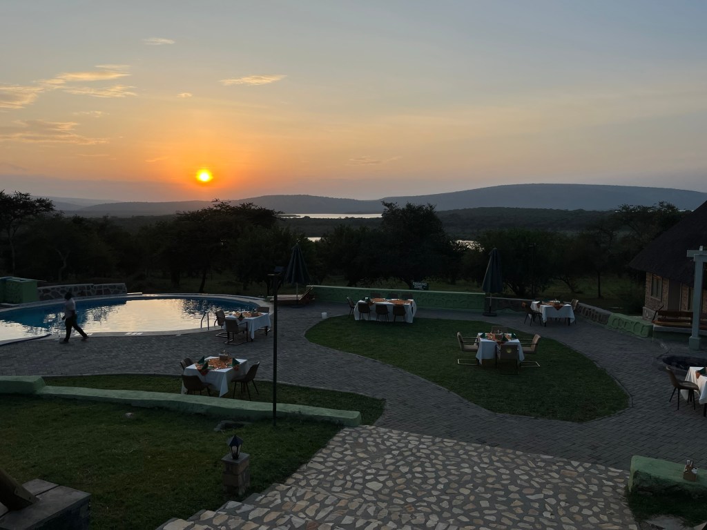 Das Abendessen war hervorragend. Danach musste uns ein bewaffneter Angestellter ins Zimmer bringem weil bei Dunkelheit die Flußpferde in der Anlage grasen. Und das kann gefährlich werden.