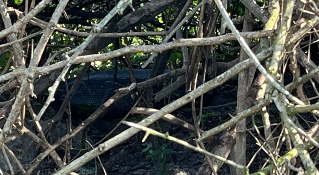Und zum Abschluss sind wir noch zu einer Python gefahren, die, in einem Busch versteckt, gerade ein Impala verdaut hat. Der Ranger hat uns das Foto gezeigt wie die Python gerade das Impala verschlingt. Arg.