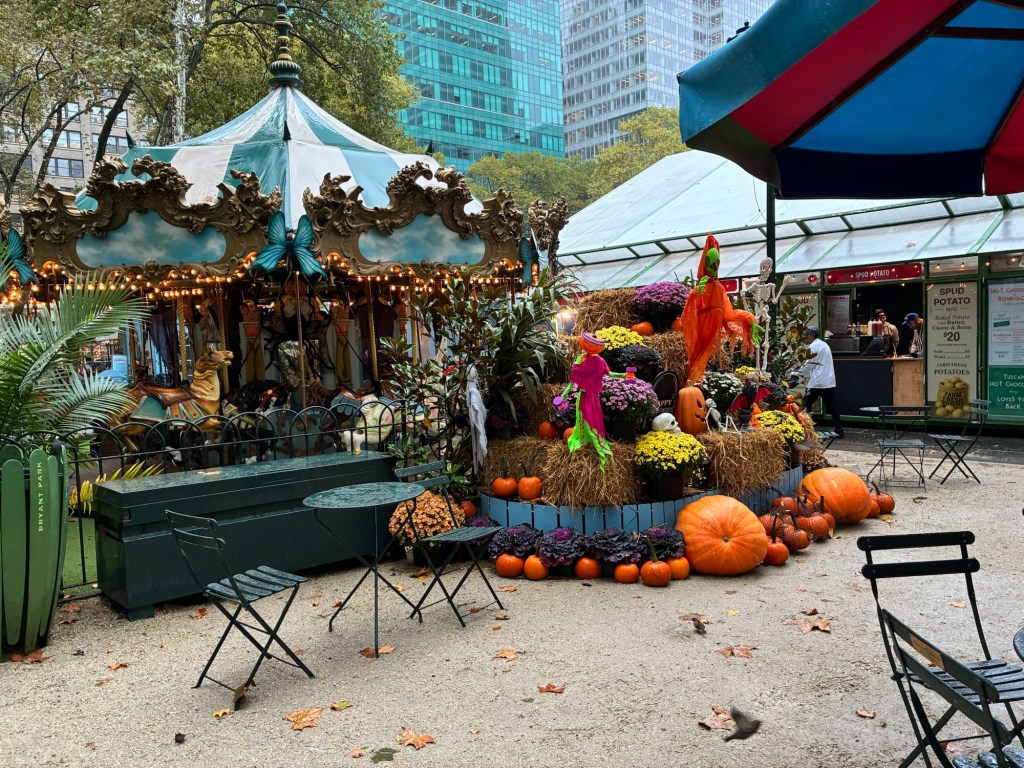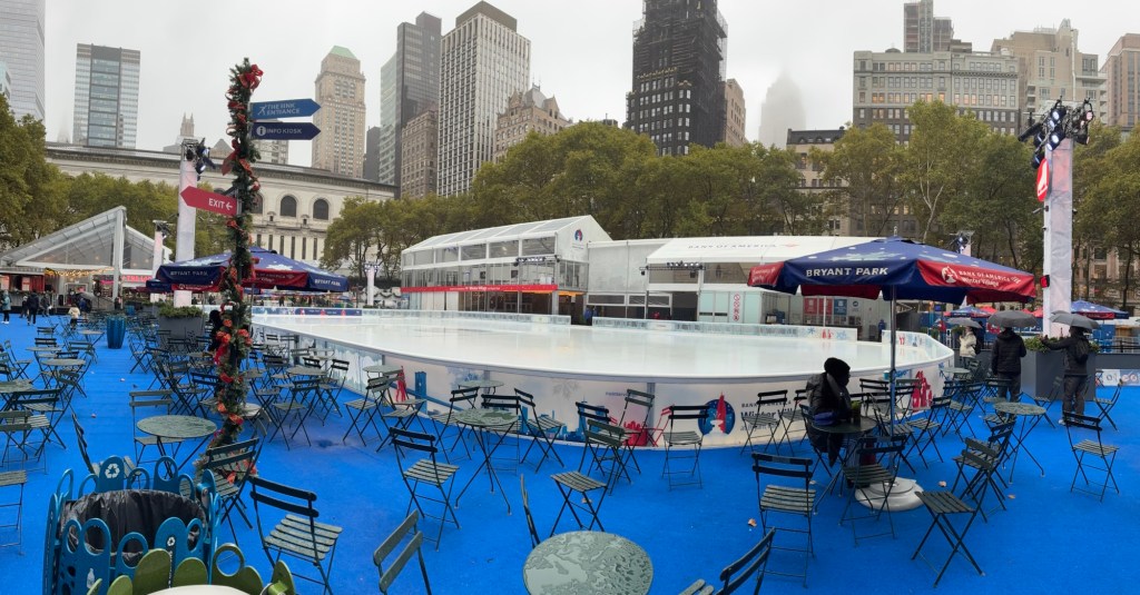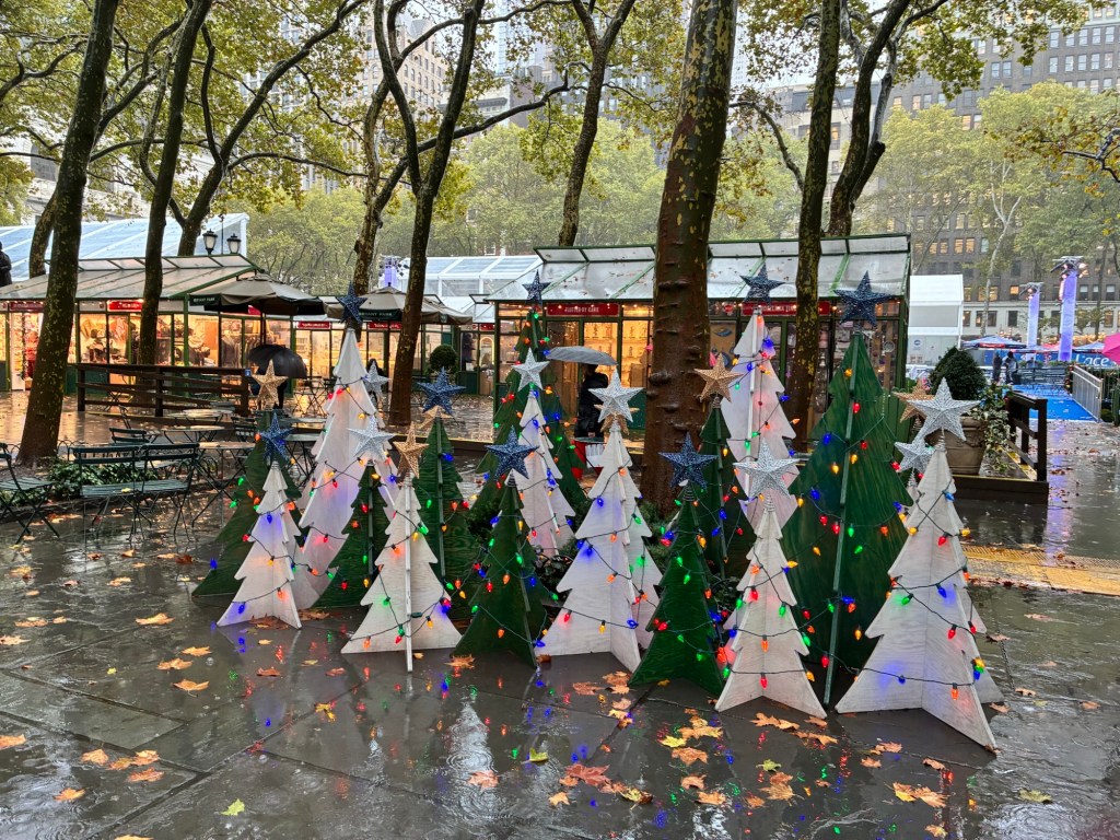 Im Bryant Park ist das Winter Village schon aufgebaut. Jedoch wenig Interesse bei Regen an einem Donnerstag Vormittag.