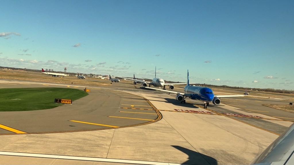Der Weg zum Flughafen war ohne Stress und Probleme relativ komfortabel. Und jetzt sind wir schon an Bord und warten auf den Abflug. Ins warme Kalifornien.