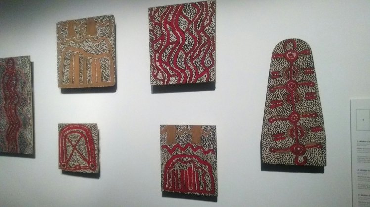 A múzeum nagyon érdekes volt, egyrészt aboriginal festők képeit néztük meg, akik storykat festenek igen stilizált motívumokkal, sok sok pontocskákkal, jó színesen.