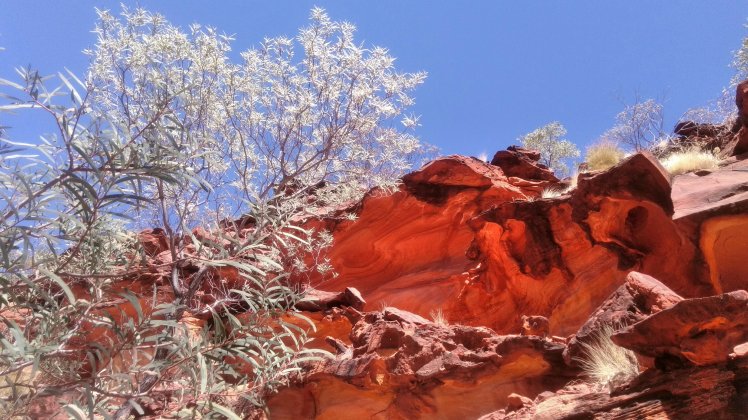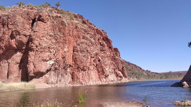 Alice Springstől már csak kb 140km volt az egész, most dimbes-dombos a táj. Elég hamar a kempingbe értünk, elfoglaltuk a helyünket és rögtön le is sétáltunk a szurdokhoz a vízhez. Gyönyörű szurdok, hűvös folyó, lehetett volna fürdeni, de ezt most kihagytuk. Láttunk pár madarat és kiültünk kicsit a sziklákra. Jó szeles az idő ma, úgyhogy nem üldögéltünk sokat.