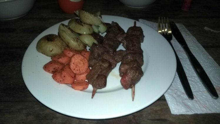 Vissza a kempingbe, egy jó kis lehűlés a medencében, majd egy jól megérdemelt hideg sör/cider. Zuhany, majd összepakoltuk a vacsi cuccokat. Mai menü: kenguru nyárson, krumpli, répa és kelkáposzta saláta. A szabadtéri grillhelyekár mind foglaltak voltak, így az outback kitchen-ben főztük és ettük meg a vacsinkat.
