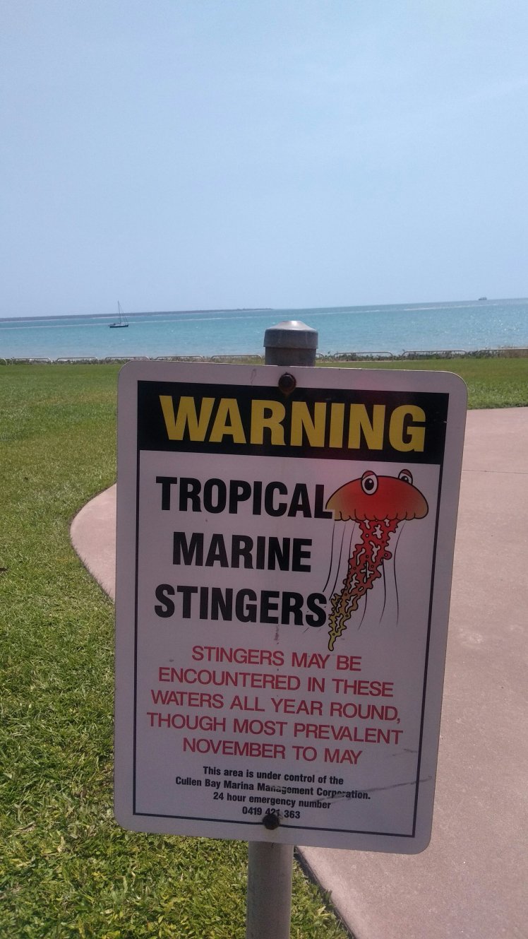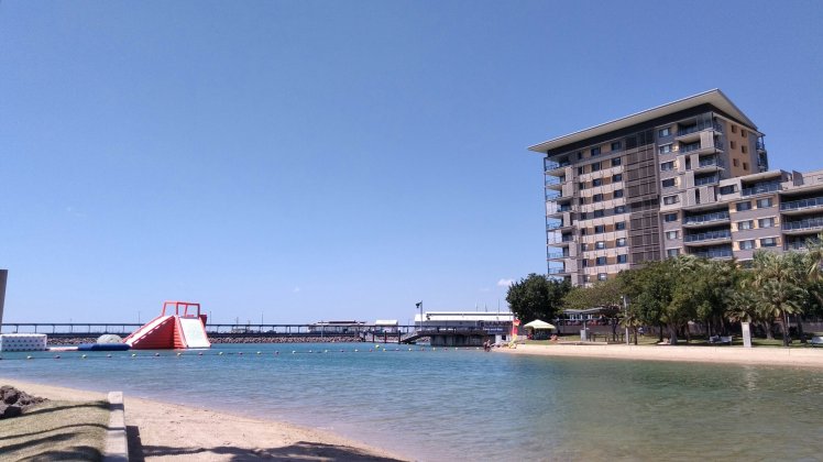 Na így aztán lesétáltunk a Darwin Waterfront-hoz ahol le van zárva az öböl egy csücske, hogy lehessen krokodil-mentesen úszni, sőt a jellyfish mentesítésért is mindemt megtesznek, de persze garancia nincs rá. Viszont van egy hullámfürdő is szemben.