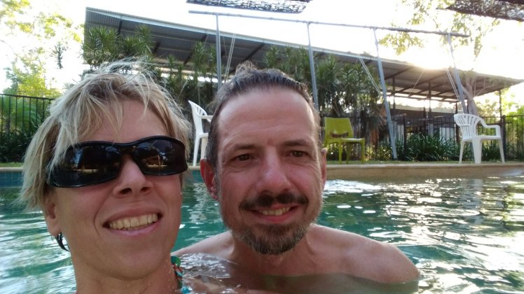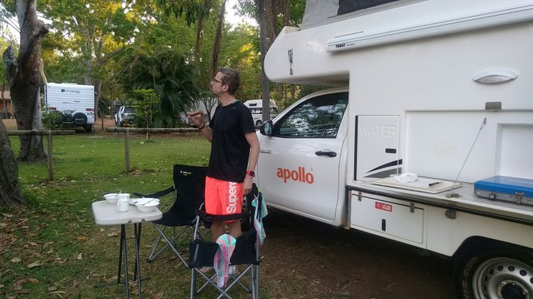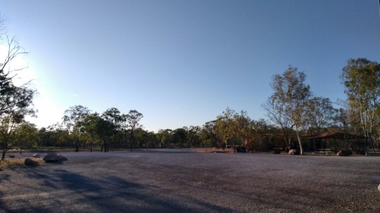Ezután már csak a kempingbe vezetett az utunk, ahol az elején persze kicsit bénáztunk, mégiscsak az első ilyen éjszakánk… De aztán berendezkedtünk, rákapcsoltuk a kocsit az áramra, fürödtünk egyet a medencében, zuhany a saját különbejáratú zuhanyzónkban, majd vacsi rittyentése. Kaját nyilván túl keveset vettünk, ami nem azért baj, mintha nem lenne itt elég bolt, csak már Darwinban is egy kisebb vagyont hagytunk ott, ez pedig egyre drágább lesz.