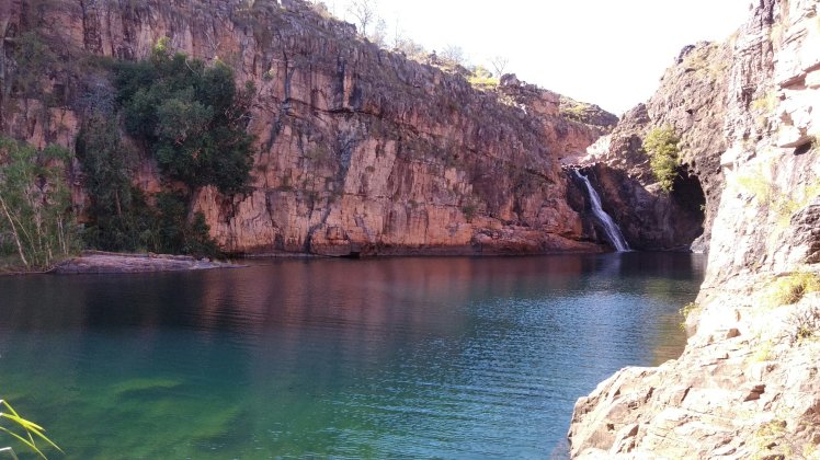 Következő vízesés Gunlom, ahol ugyan a vízesés most elég vékonyka volt, itt viszont az a különlegesség, hogy fel lehet menni a tetejéhez, ahol a fenti infinity poolban lehet fürdeni. Előbb azért megebédeltünk a parkban (itt is mindenhol vannak ingyen bbq-k…), aztán irány a hőségben felfele.