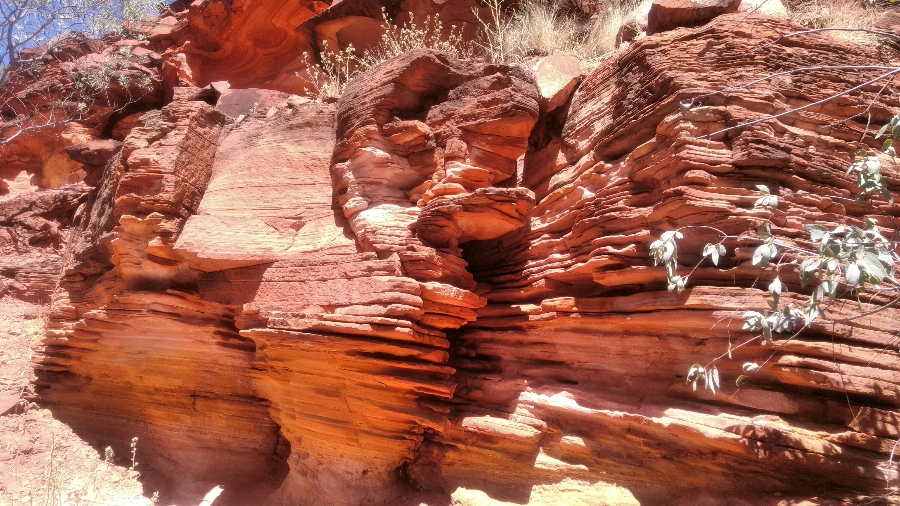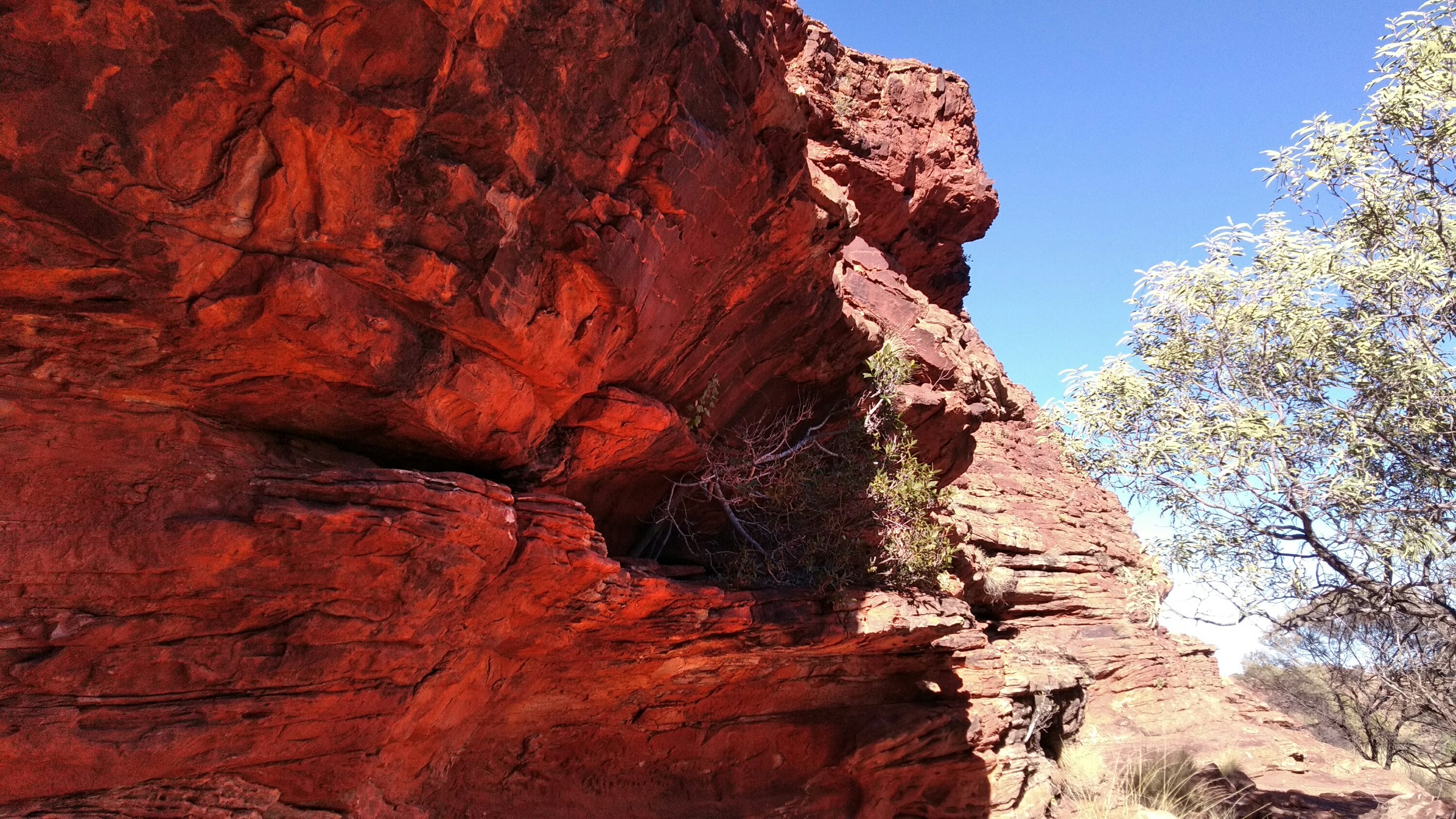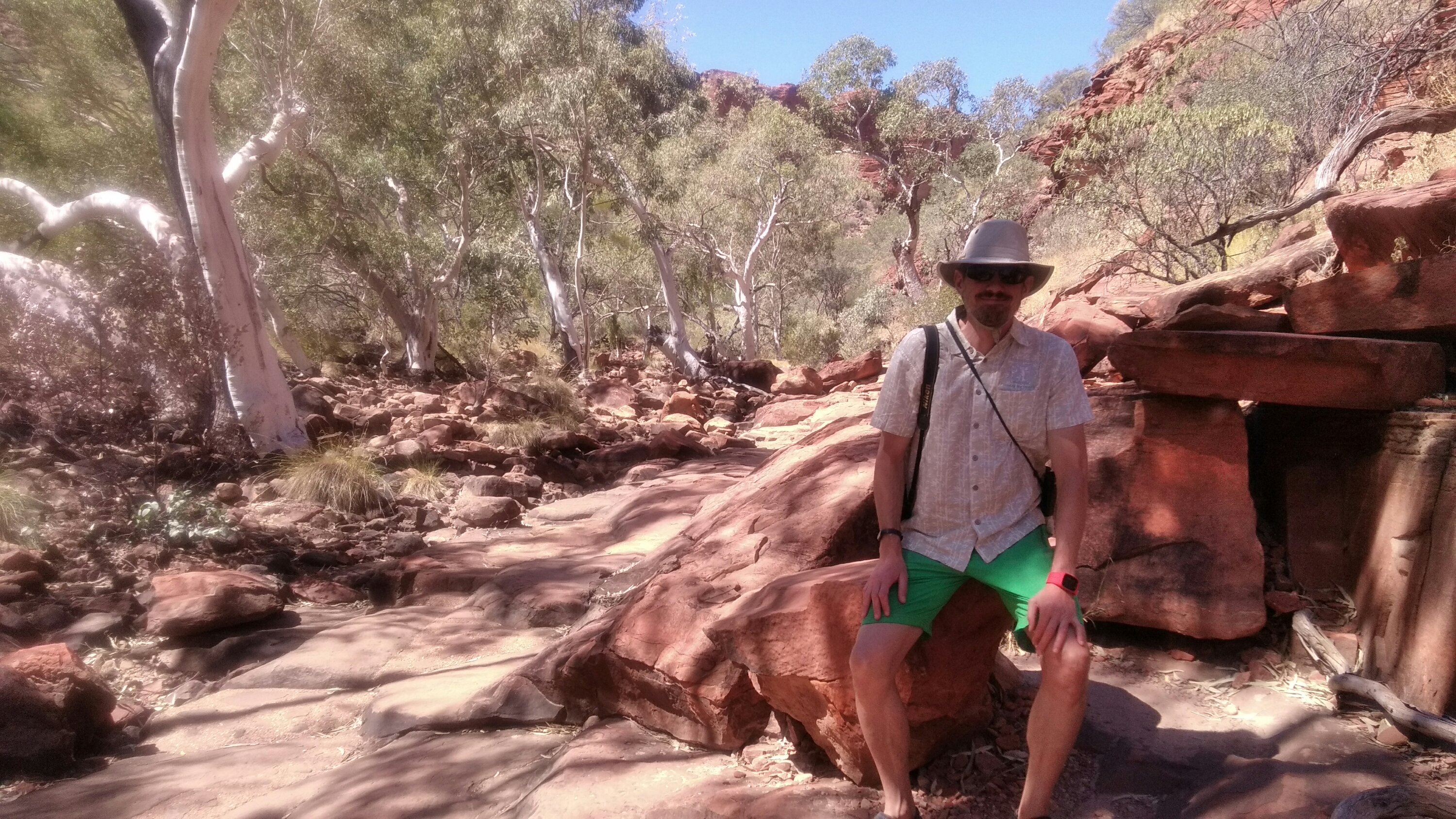 Alice Springstől már csak kb 140km volt az egész, most dimbes-dombos a táj. Elég hamar a kempingbe értünk, elfoglaltuk a helyünket és rögtön le is sétáltunk a szurdokhoz a vízhez. Gyönyörű szurdok, hűvös folyó, lehetett volna fürdeni, de ezt most kihagytuk. Láttunk pár madarat és kiültünk kicsit a sziklákra. Jó szeles az idő ma, úgyhogy nem üldögéltünk sokat.
