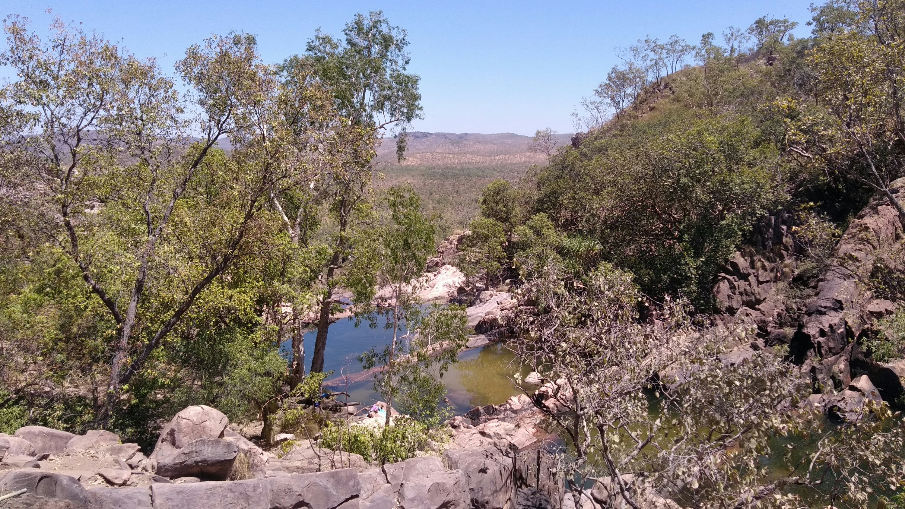 Következő vízesés Gunlom, ahol ugyan a vízesés most elég vékonyka volt, itt viszont az a különlegesség, hogy fel lehet menni a tetejéhez, ahol a fenti infinity poolban lehet fürdeni. Előbb azért megebédeltünk a parkban (itt is mindenhol vannak ingyen bbq-k…), aztán irány a hőségben felfele.