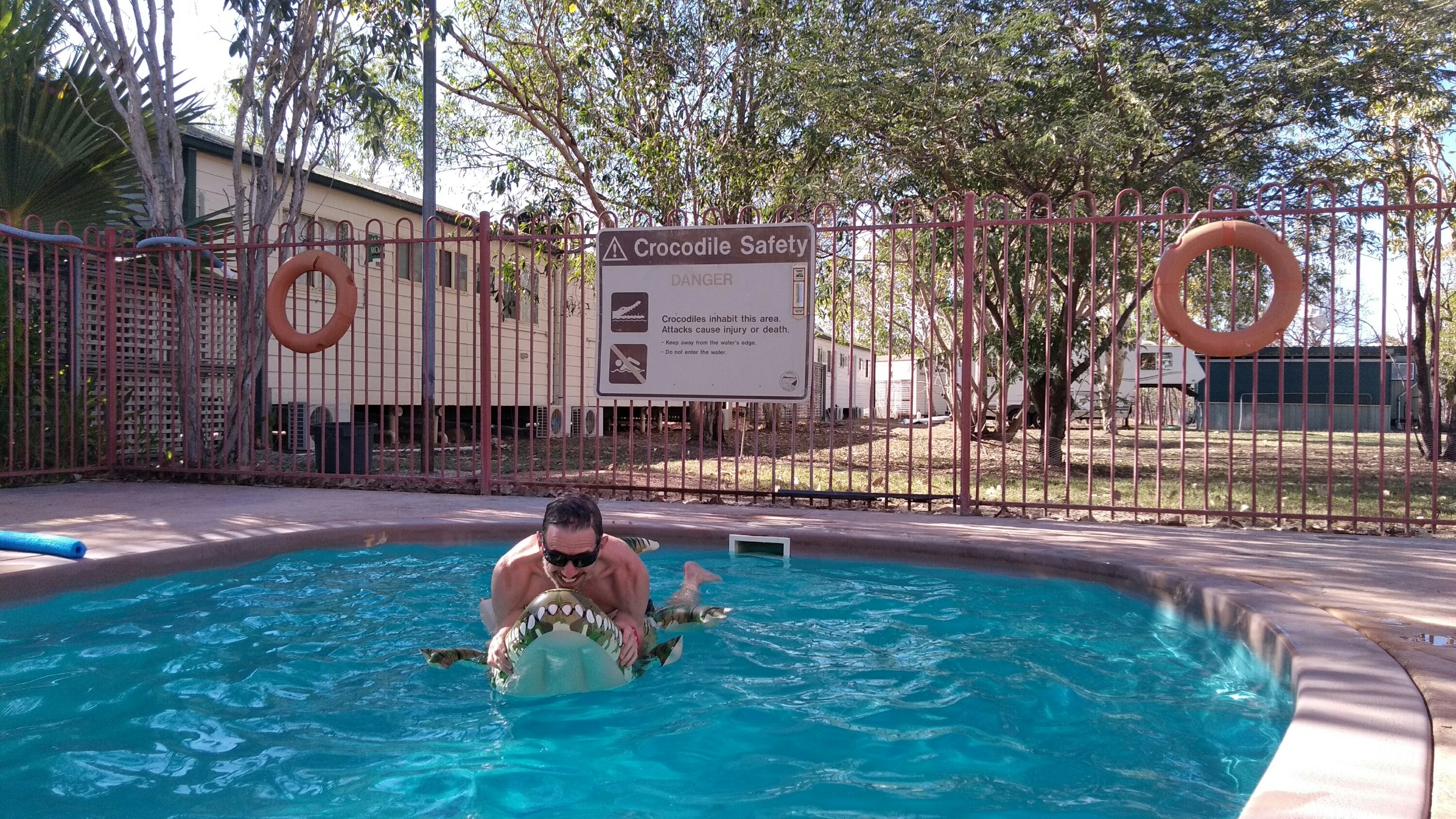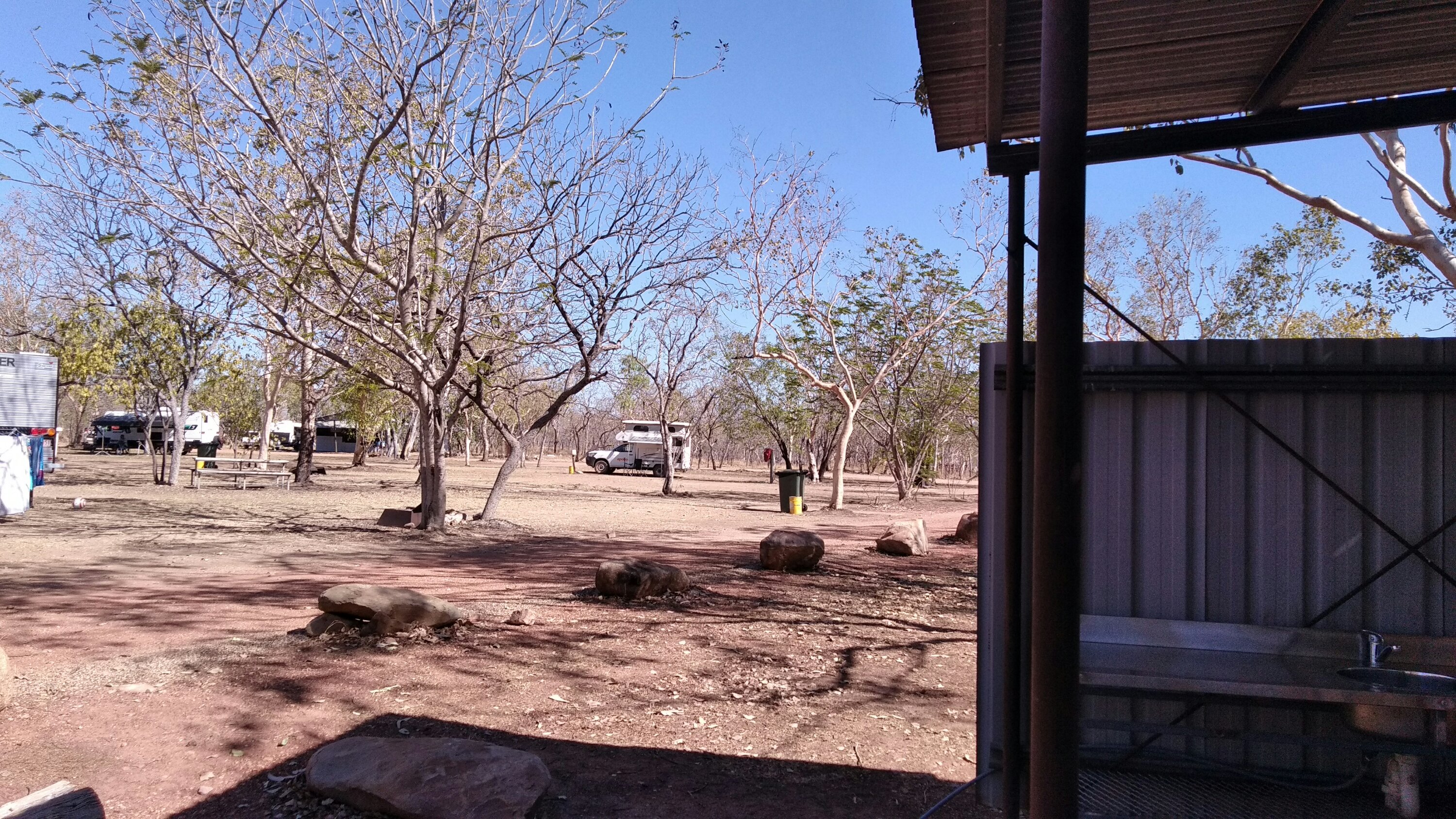 Ezután már csak a kempingbe vezetett az utunk, ahol az elején persze kicsit bénáztunk, mégiscsak az első ilyen éjszakánk… De aztán berendezkedtünk, rákapcsoltuk a kocsit az áramra, fürödtünk egyet a medencében, zuhany a saját különbejáratú zuhanyzónkban, majd vacsi rittyentése. Kaját nyilván túl keveset vettünk, ami nem azért baj, mintha nem lenne itt elég bolt, csak már Darwinban is egy kisebb vagyont hagytunk ott, ez pedig egyre drágább lesz.