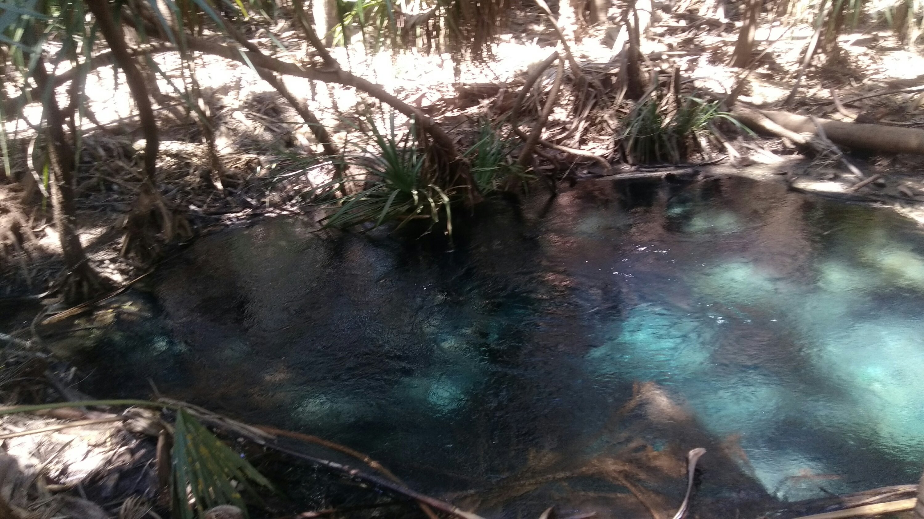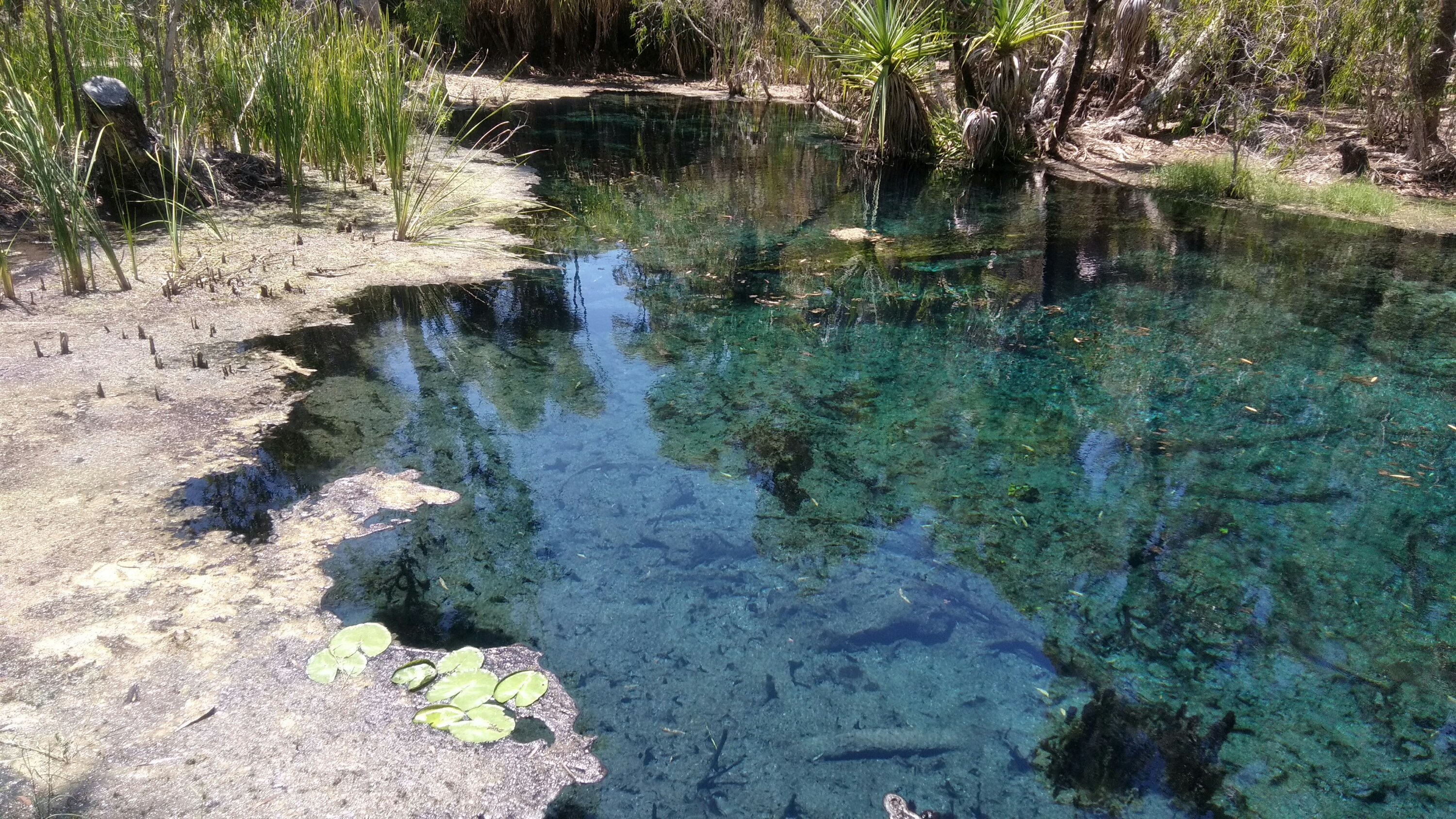 Tankoltunk, majd irány Mataranka, ahol a földből jövő melegvizű forrásokban lehet jókat pancsikolni. Lehűlést ugyan nem kínálnak, de gyönyörű kristálytiszta a víz, és igencsak egzotikus a pálmák között. Két helyen is megálltunk, az elsőnél kevesebben voltak, itt kicsit természetesebbre volt hagyva az egész, a víz szélén most a száraz évszakban összegyűlik az elhalt növényzet, de ettől függetlenül a víz gyönyörű. Hagytuk magunkat az árral lesodorni, majd visszaúsztunk árral szemben.