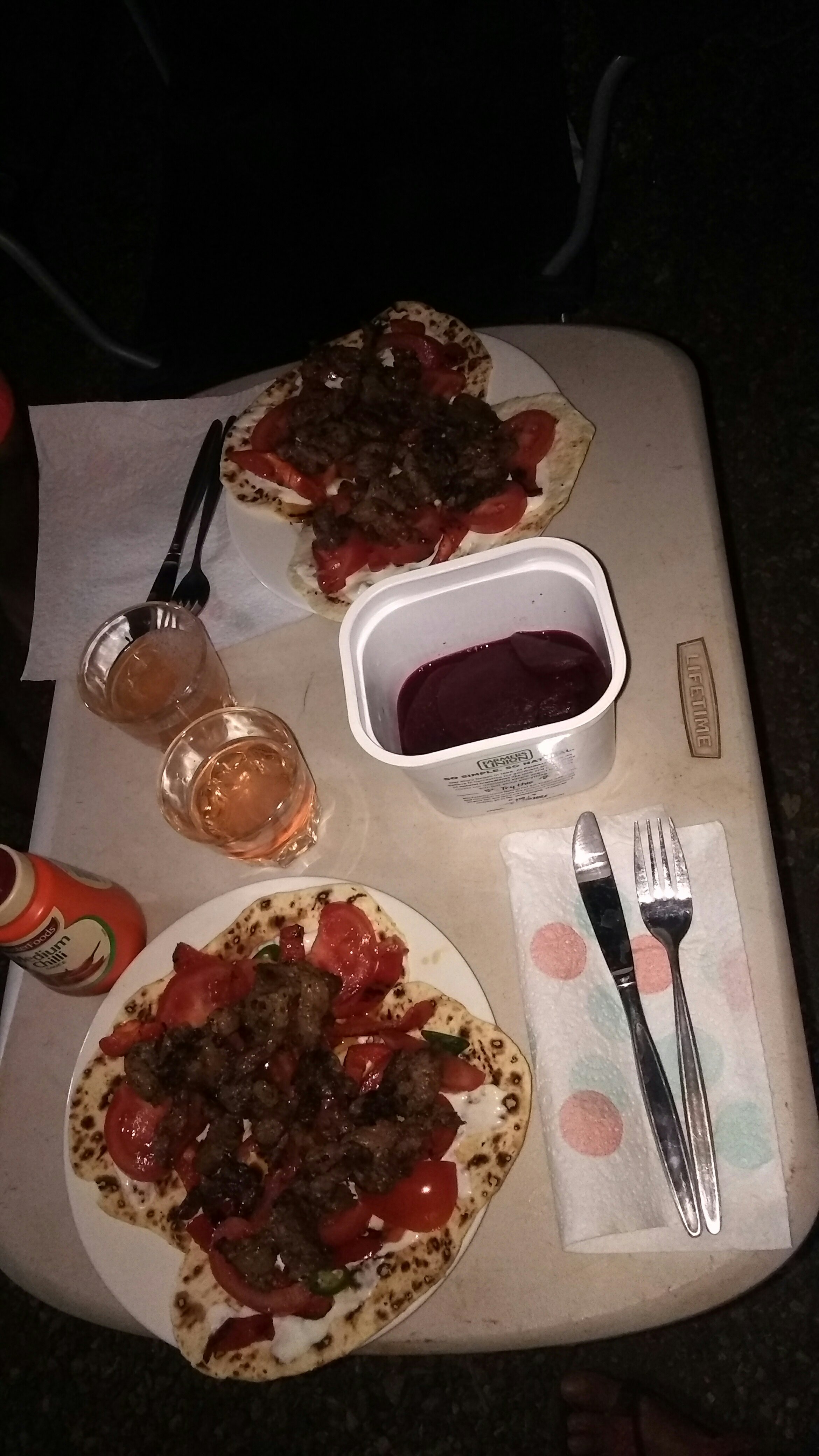 Nincsenek sokan a kempingben. Egy csoport kb 8 gyerekkel, ők kicsit elfoglalták a zuhanyokat, amíg az anyjuk rájuk nem ordított 😉 de aztán valami jó kis kolbászokat kaptak vacsira. Mi ma megint konzervlevest (Campbell’s vagy Heinz, de meglepően jók) é spaghettit chilis paradicsomszósszal ettünk, nagyon jó volt. Desszert: brownie. Nem mi csináltuk 😉