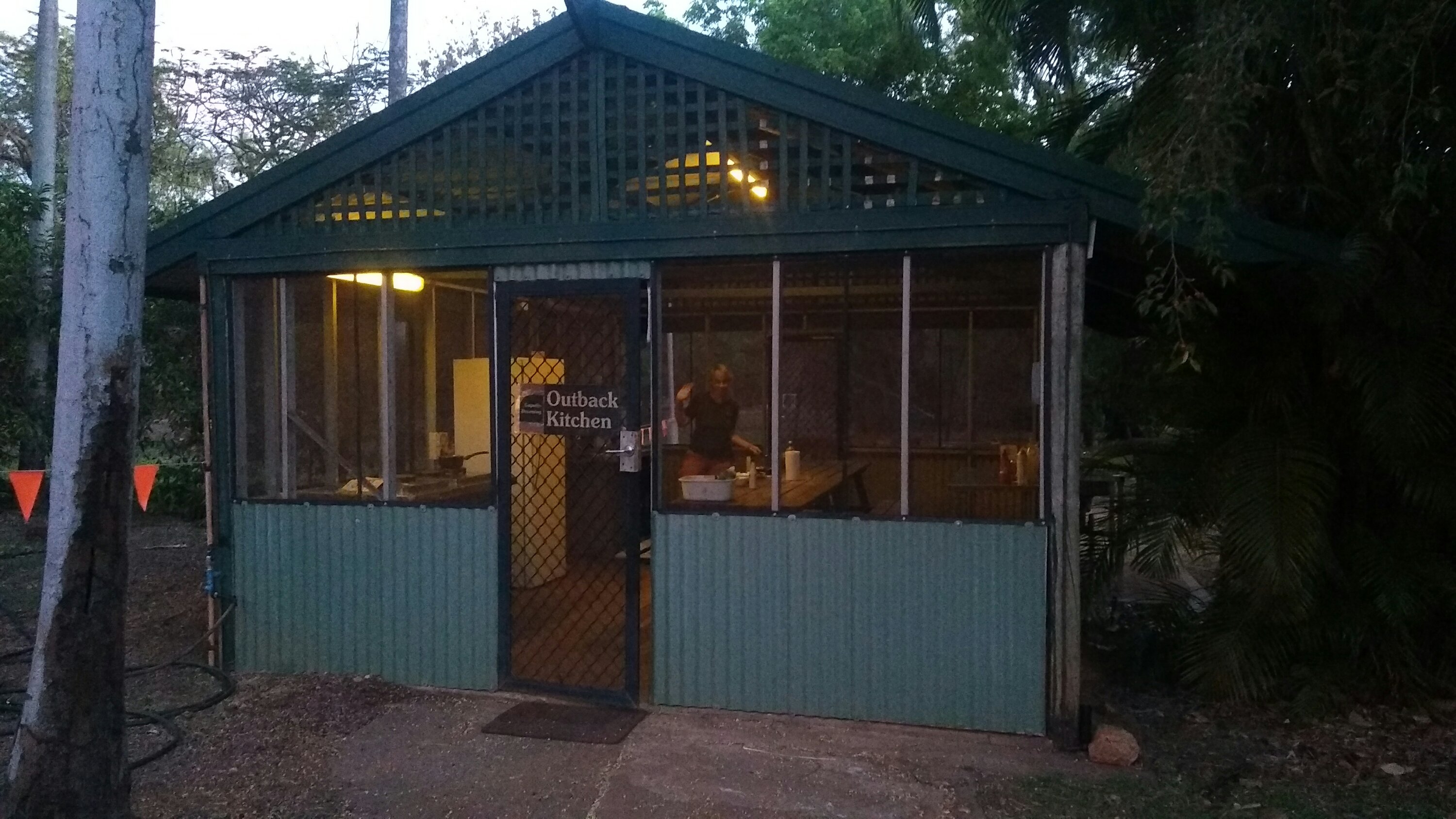 Vissza a kempingbe, egy jó kis lehűlés a medencében, majd egy jól megérdemelt hideg sör/cider. Zuhany, majd összepakoltuk a vacsi cuccokat. Mai menü: kenguru nyárson, krumpli, répa és kelkáposzta saláta. A szabadtéri grillhelyekár mind foglaltak voltak, így az outback kitchen-ben főztük és ettük meg a vacsinkat.